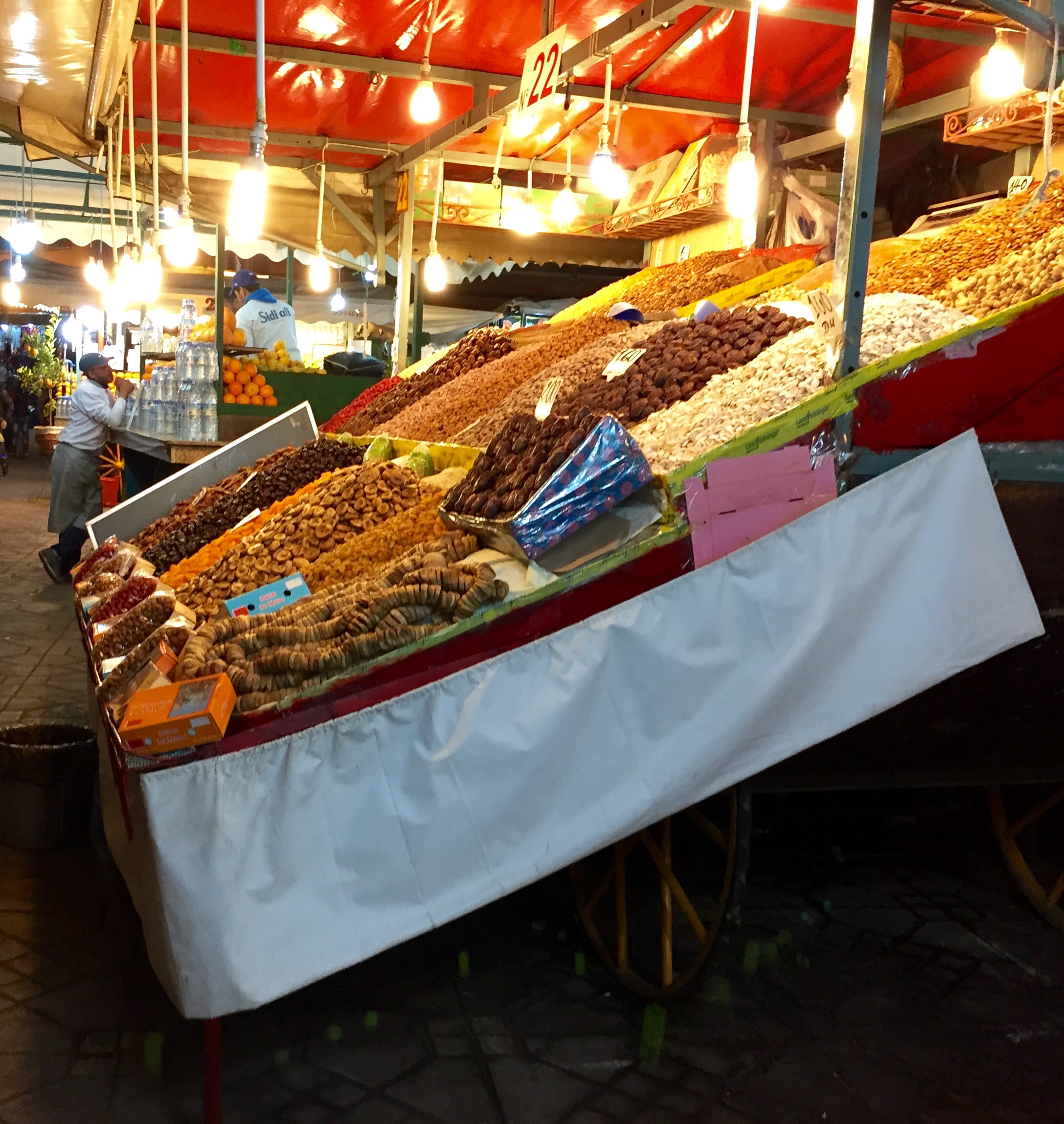 The Place Jemaa el Fna (the medina’s central square) comes to life at night. Row after row of food vendors line the square. Street performers play drums. Sing. Juggle. Tell stories. Charm snakes (the snake charmers come out during the day too). Engage passersby with games. On our first night, we found a spot at one of the food tents, ordered $3 worth of meat, which came with bread, olives and a coca cola. Hands down one of the best meals we ate in Morocco. It was also the cheapest.